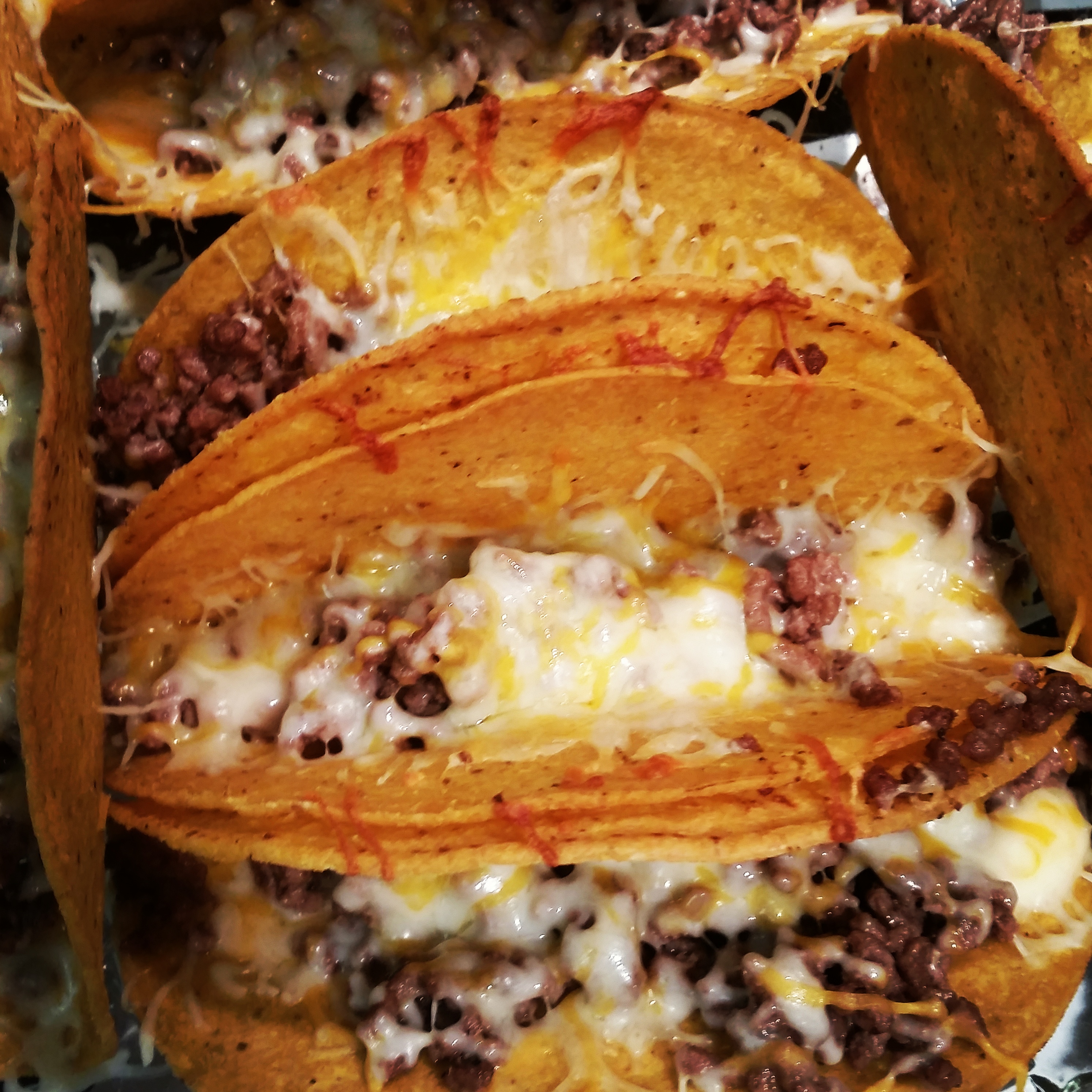 Put your shells in a long casserole dish. Put cheese on the bottom. Add in a spoonful of beef to each taco. Top with more cheese. Bake for 15 minutes or so until shells turn golden brown and cheese is all melted. Add your favorite taco toppings. You could make a ton of these for a party and set out a taco bar!