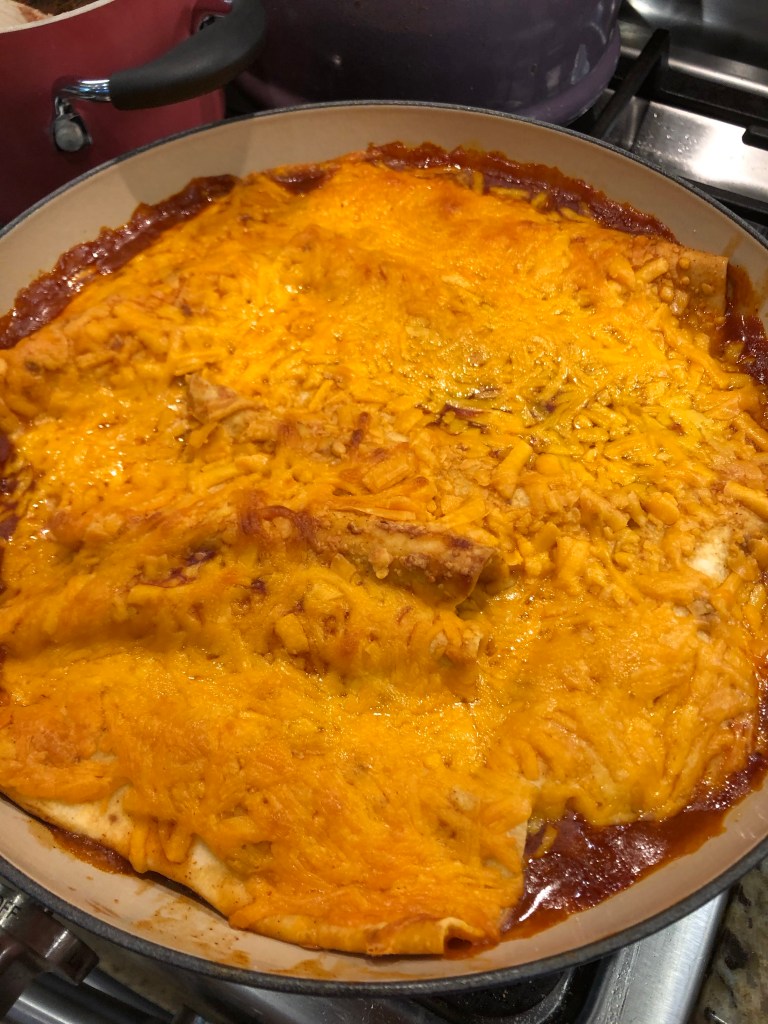 Started by cooking this pork picnic with 2 cans of chopped green chilies, a few shakes of cumin, coriander, garlic powder, onion powder, chili powder, salt, and pepper. Cooked it low and slow in the crock pot for 10 hours. I used the Green Chili Pork to make these enchiladas. Super easy! I shredded the pork and placed some along with shredded cheese land rolled them up in tortillas.Then I added a large can of enchilada sauce and more cheese on top. I cooked them at 350 for about 30 minutes.