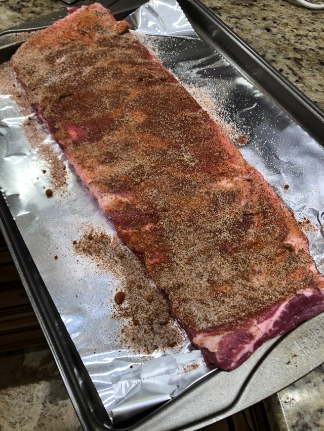My family LOVES ribs, so when I saw these at the grocery store, I knew I had to get them. Usually I buy them already cut up, but I was up for the challenge of trying to cook them in the oven as a whole rack. I researched tons of recipes, and decided on doing a rub then adding a sauce at the end.