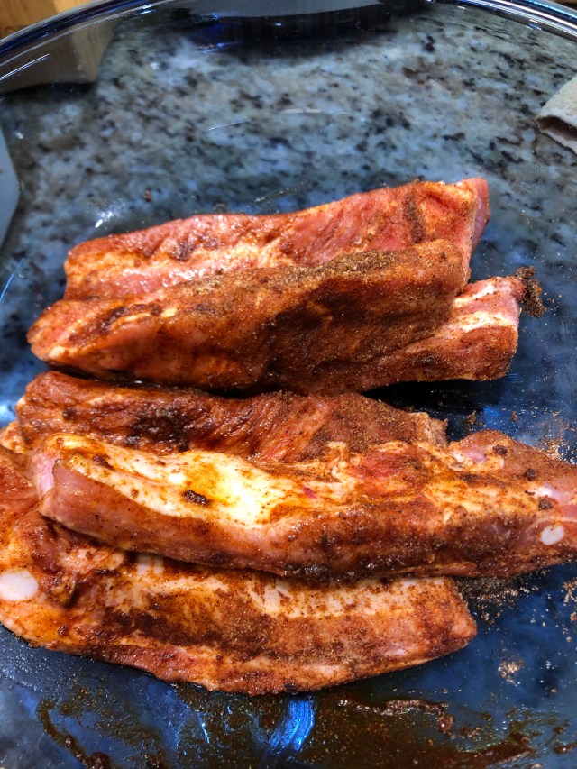I preheated the oven to 300. In a small bowl I made a rub with different spices from my cabinet. I didn’t really measure; I used a combo of cumin, coriander, smoked mild paprika, garlic and onion powder, and chili powder. I rubbed the mixture all over ribs and placed on a baking sheet with aluminum foil.