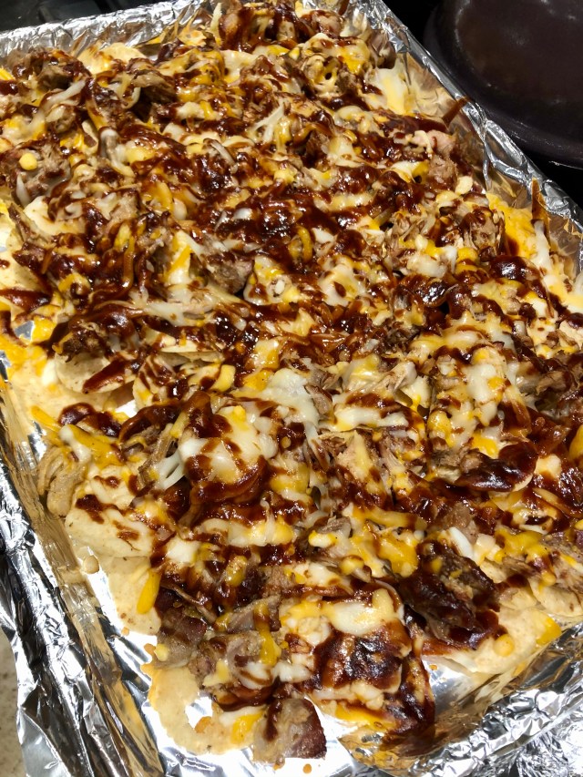 Once the ribs are finished, place them on an aluminum lined sheet tray and coat in BBQ sauce. Broil for about 5 minutes. Add more BBQ Sauce to the table in case people like it extra saucey 😉