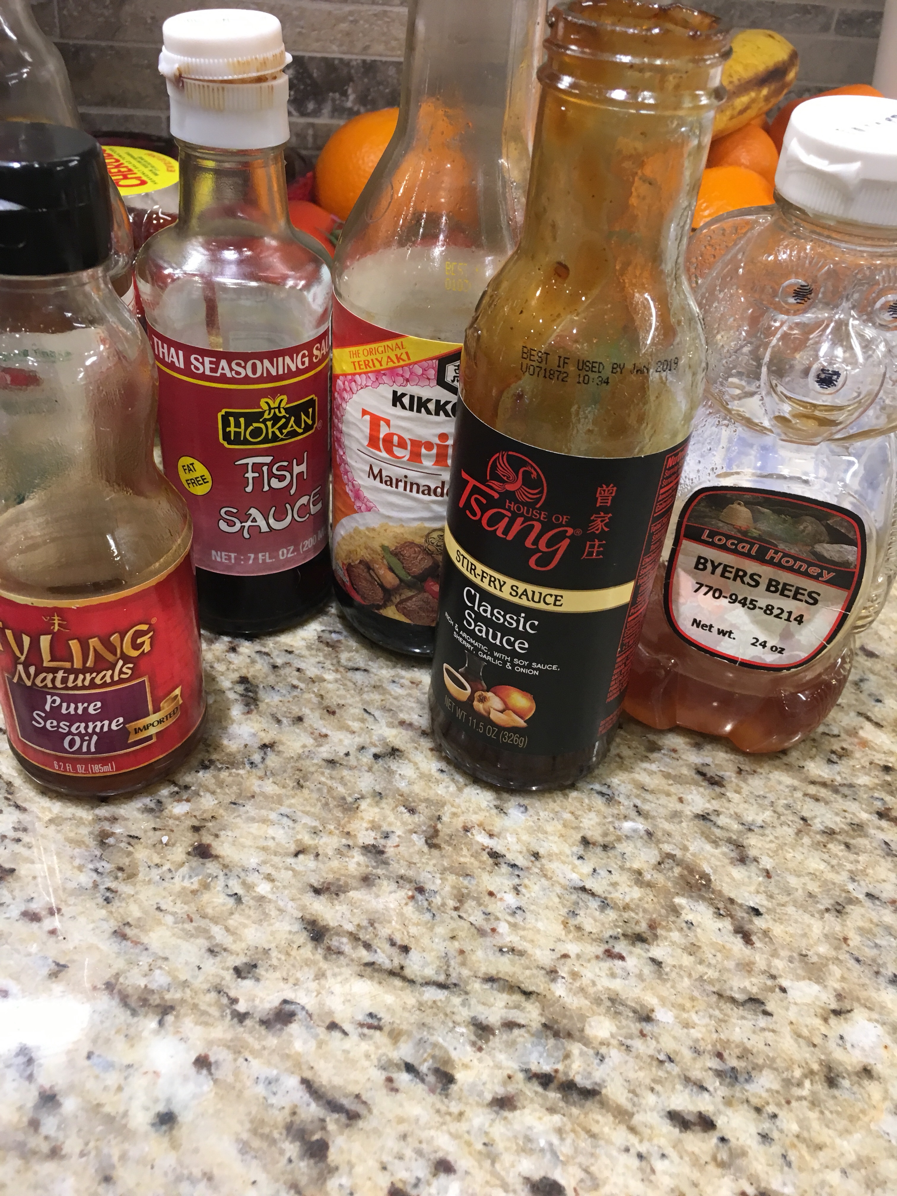 Teriyaki-Sesame- I didn’t measure. I sort of just used up a little bit of this and that from my Asian pantry plus some honey to add a touch of sweetness. The only extra thing I put in the sauce that is not pictured was the last of the hoisin that I had already rinsed out and recycled. I added a bit of minced garlic as well.