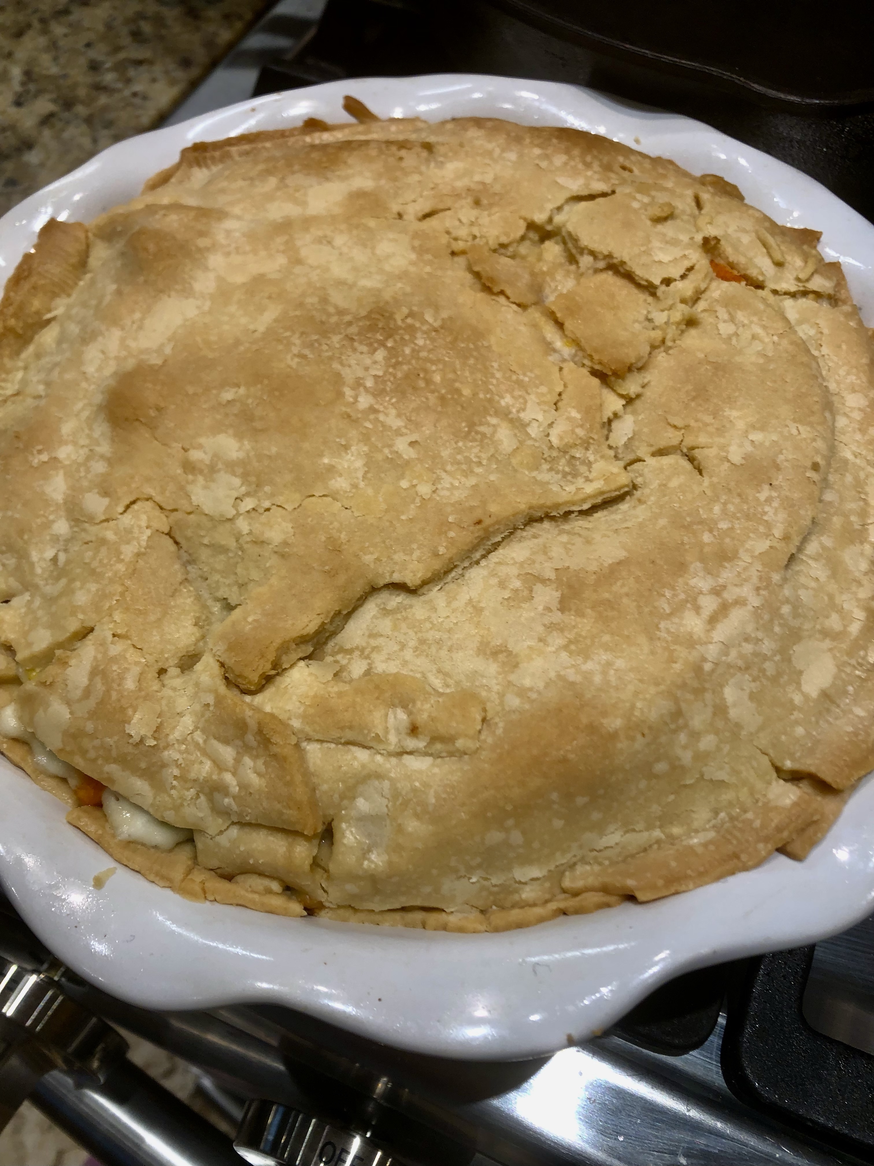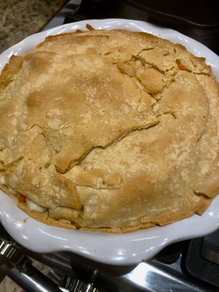 I lined the pie pan on the botttom with one pie crust. Then I filled it with the chicken pot pie filling and topped it with the other pie crust. They were a little banged up, so they didn’t look perfect. Who cares! I brushed the top with butter and poked a few hole in the top for steam to escape. Then I cooked it for about 25 minutes (or until brown). Amazing!
