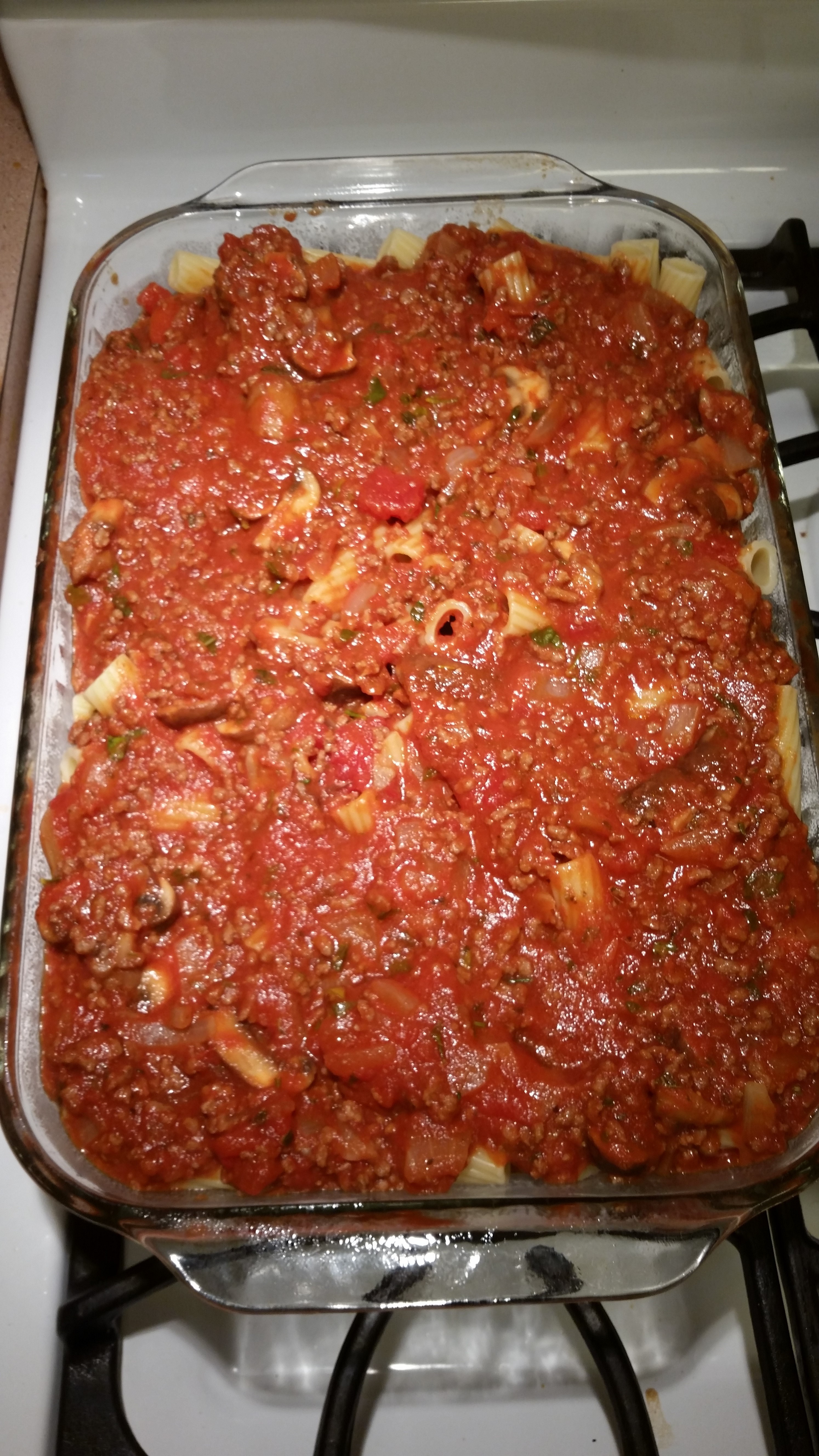 Assemble in a large casserole pan layering sauce, pasta, meat, and cheese.