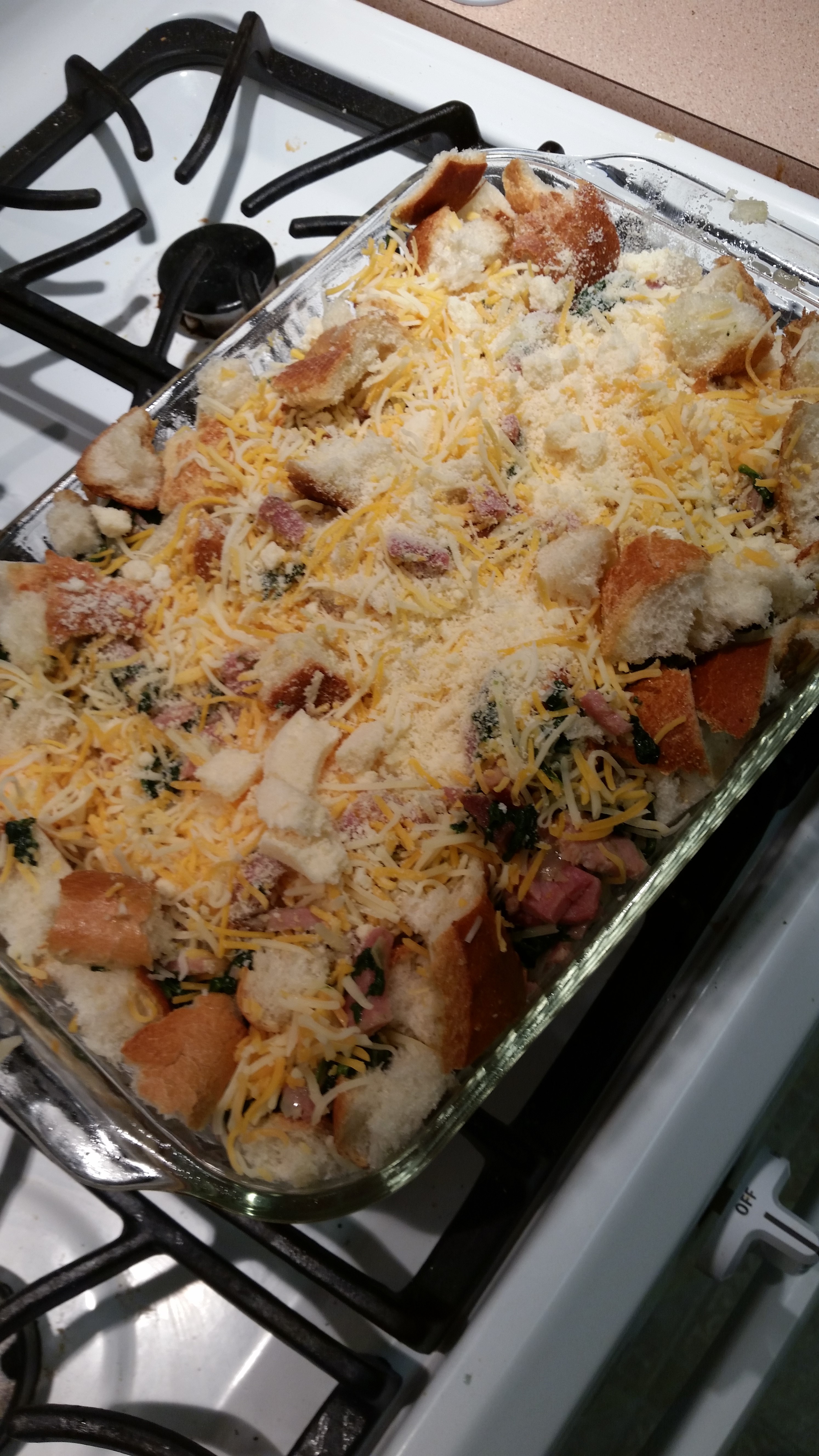 Add cheese, then breadcrumbs, then cubed butter on top of your pasta mixture. Bake at 350 until golden brown, about 20 minutes.