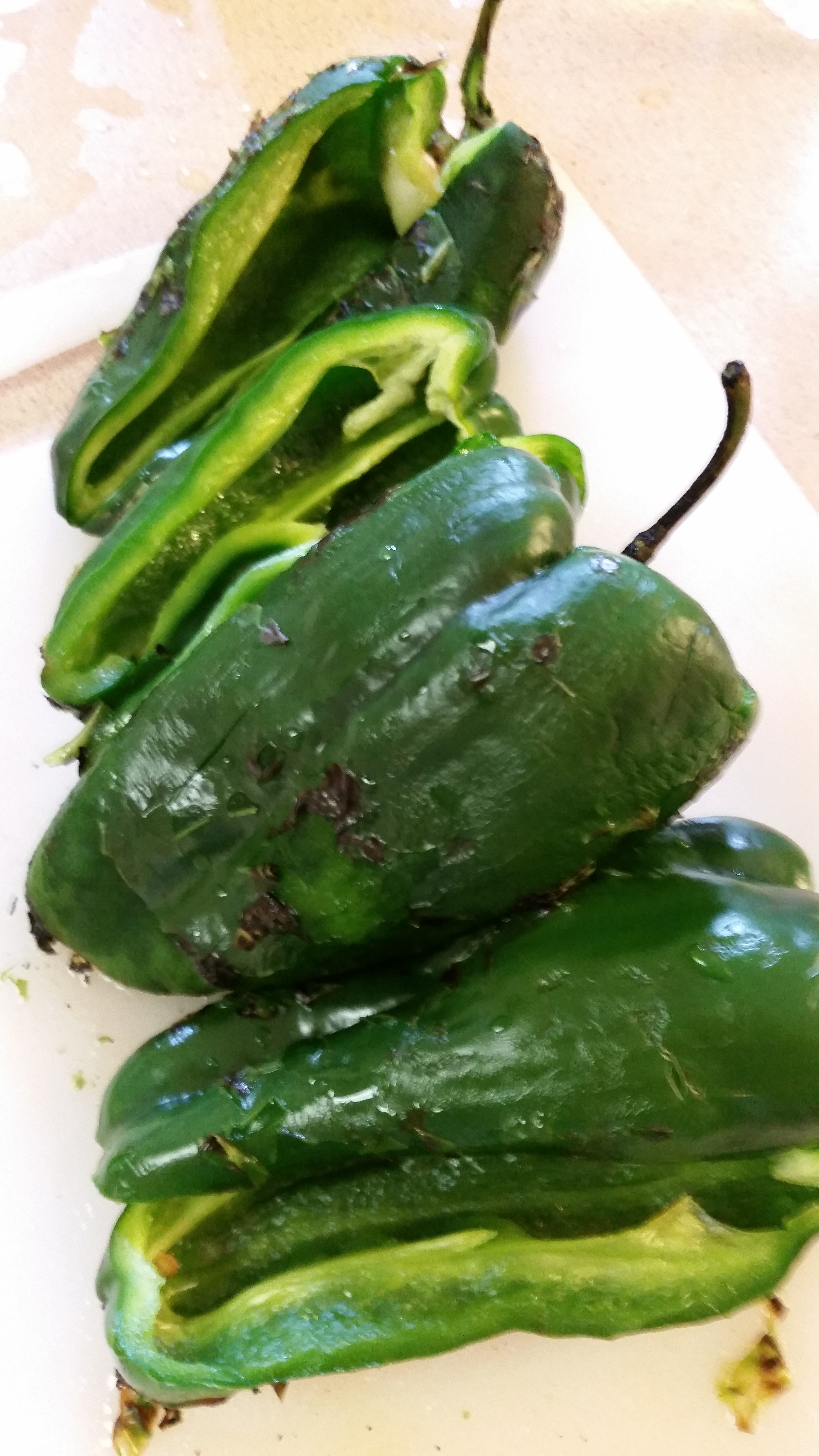 Place your roasted peppers in a zip top for 10 minutes. The peppers enclosed in the bag create a steam that will be helpful taking some of that skin off. In a few minutes rub the peppers around still in the closed bag with your fingers. If they are hot, use a towel or plastic gloves. I have no feeling left in my finger tips, so for me, I can use my bare hands. Open them up half way with a knife. Leave the tops in place. Take out the seeds and membranes.