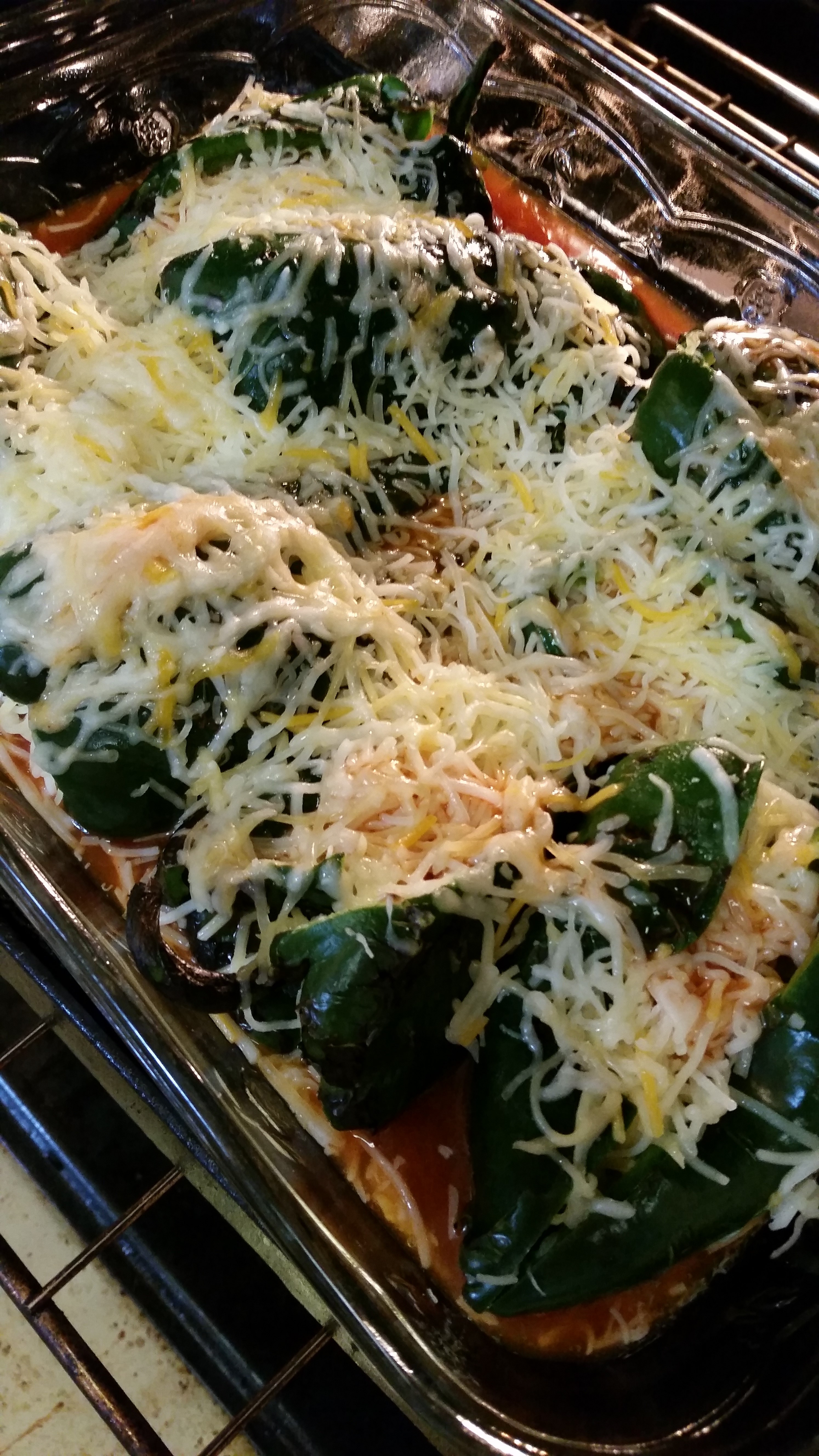 Hey guys! Anyone out there? I know it is a beautiful summer day, but if anyone out there is ready for some easy homemade Mexican food, please tune it! This recipe is super easy and delicious. Have you ever had a poblano pepper? In your nearby favorite Mexican restaurant, it is called a Chili Relleno. Basically, charred poblano peppers (slightly spicy, but just barely) stuffed with cheese and covered in a enchilada type tomato sauce and more cheese. I was thinking of my favorite Mexican place, Montery.