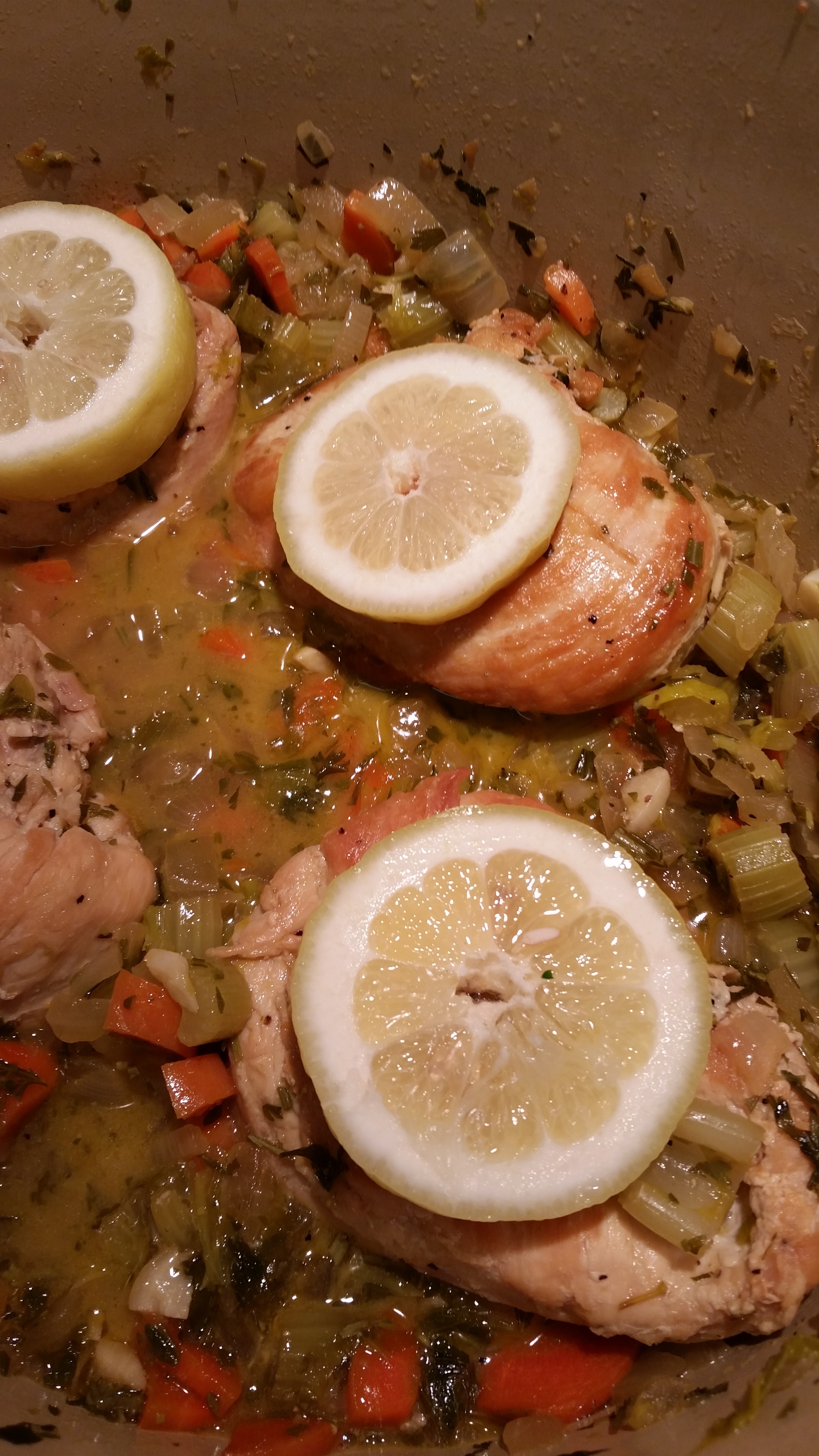 Add your chicken back in. Add a lemon slice on each chicken. Cook for another 15 minutes or so, depending on the size and kind of your chicken. Thicker cuts and dark meat will take longer. I slice in to the bottom to make sure they are cooked through.