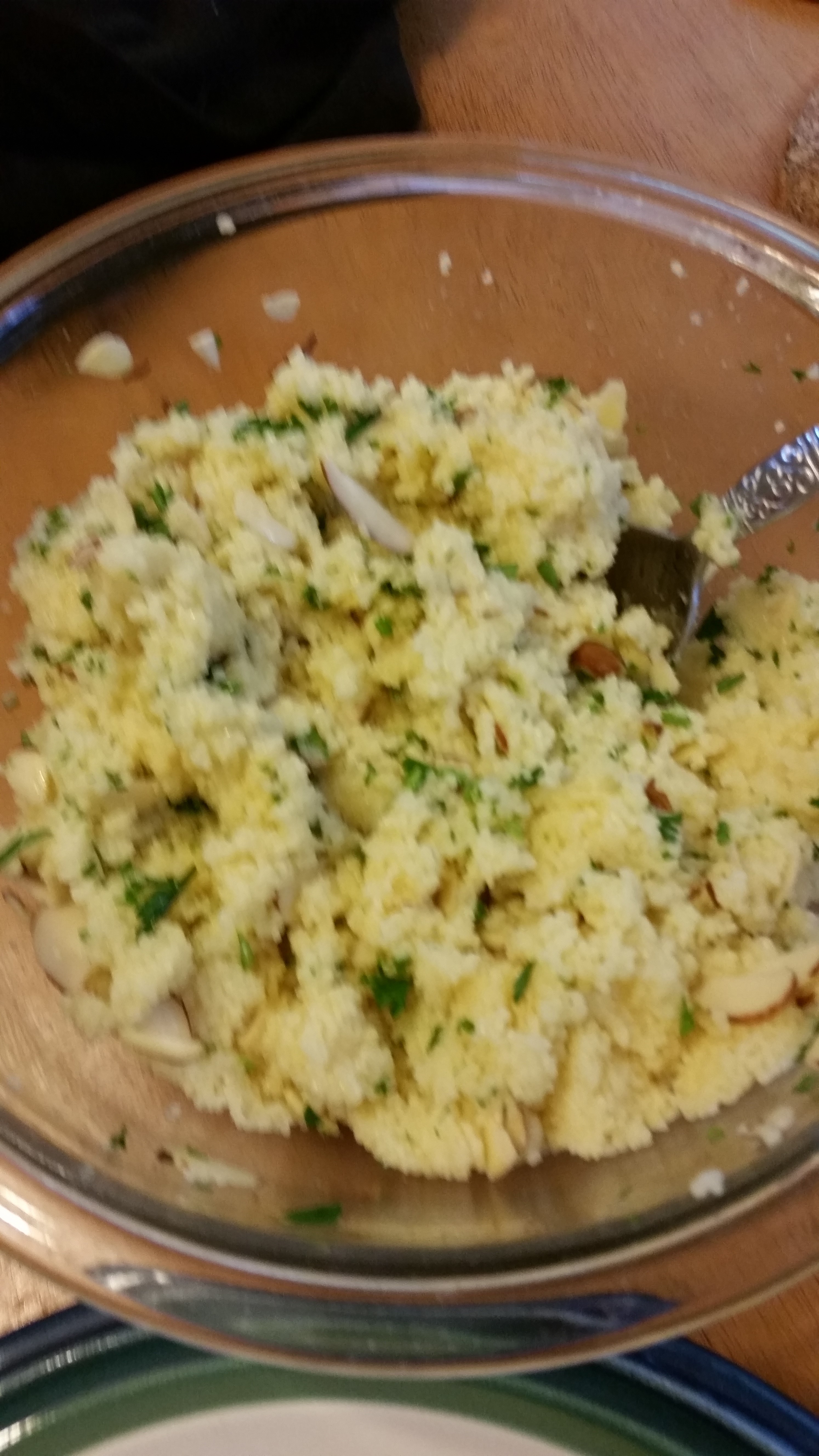 I have started to buy plain couscous. You can add your own flavors and be creative. Until you get the feel for the amount of liquid to use, follow the directions on the container. Instead of water, I used 2 juiced lemons, lemon zest, and chicken stock. So much more flavorful! At the end, I mix in the rest of my chopped herbs and a couple of handfuls of sliced almonds. My girls LOVE almonds! You could sub slivered almonds, pine nuts, etc.