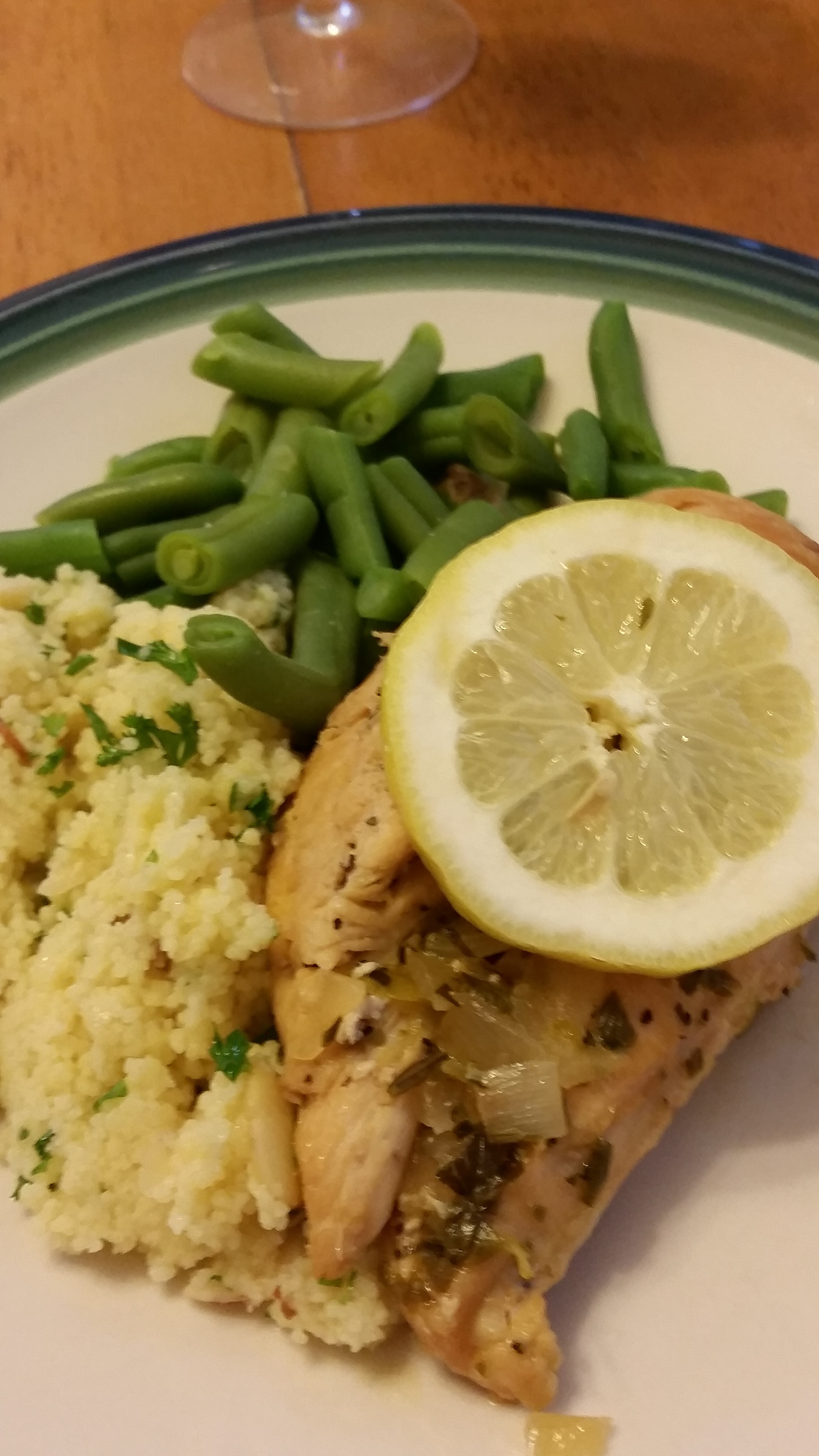 It is summer… hot and most of us spend more time in our bathing suits and short shorts than anything else. Summer is a time that we want to eat a bit lighter and fresher. Luckily, it is not hard to do. Just take a stroll through your local farmer’s market or even grocery store and there is fresh food abound! I had some chicken breasts defrosting this morning, and I was trying to think of a different way to cook them. I was sitting outside watching the girls play and reading magazines. I saw a chicken recipe in a Cooking Light Magazine that seemed intriguing. It was a spread on different kinds of summer skewers; they all looked delicious. One caught my eye…chicken, veggies, (tomatoes and peppers) and lemon skewers served with a side of herb dipping sauce. Eureka! I used this idea for my Lemon and Herb Chicken. I served it with a side of green beans and a lemon couscous with parsley and almonds. So good!!!!