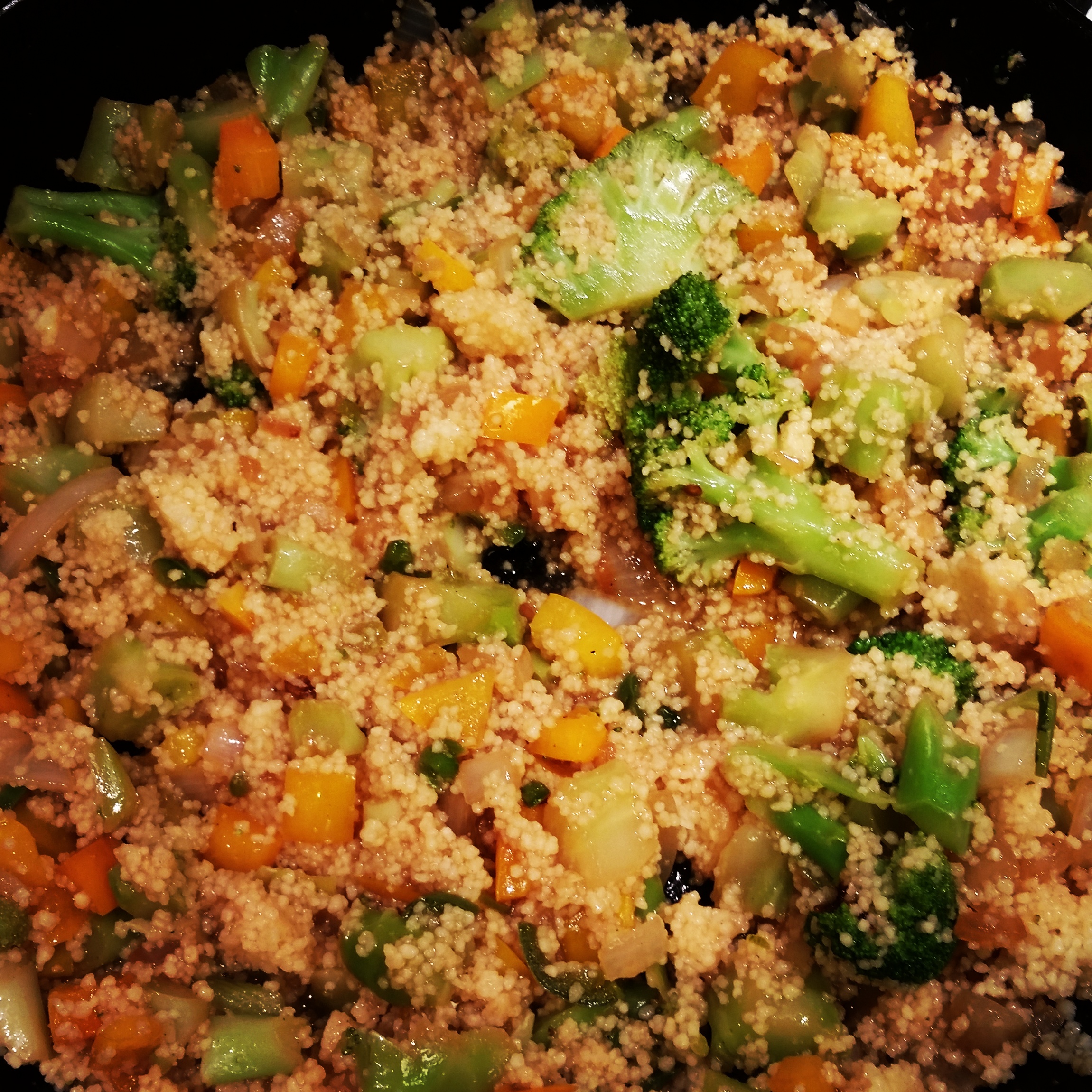 Take out the chicken and add in a bit more oil. Add in your veggies. Add seasoning. Cook for 15 minutes or so.