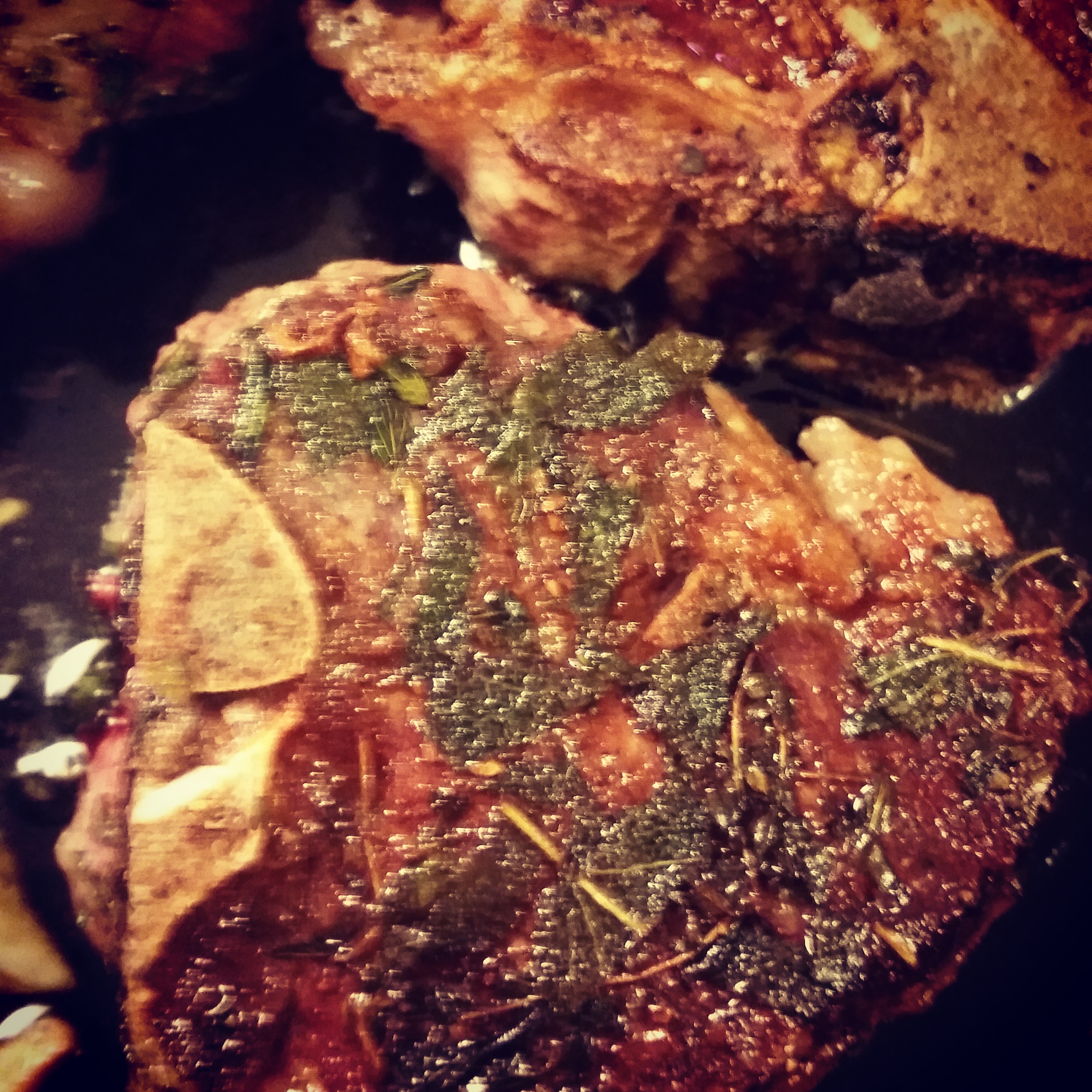 Pan sear each side in a cast iron skillet. Use as much of the herbs and garlic as possible, but in order to save yourself from oil burns, I would suggest to take it easy on the oil you add to the pan =) 6 minutes on the first side and about 3 minutes on the second (depends on the thickness; these bad boys were THICK). This is for medium rare, so if you want it more done, cook longer.