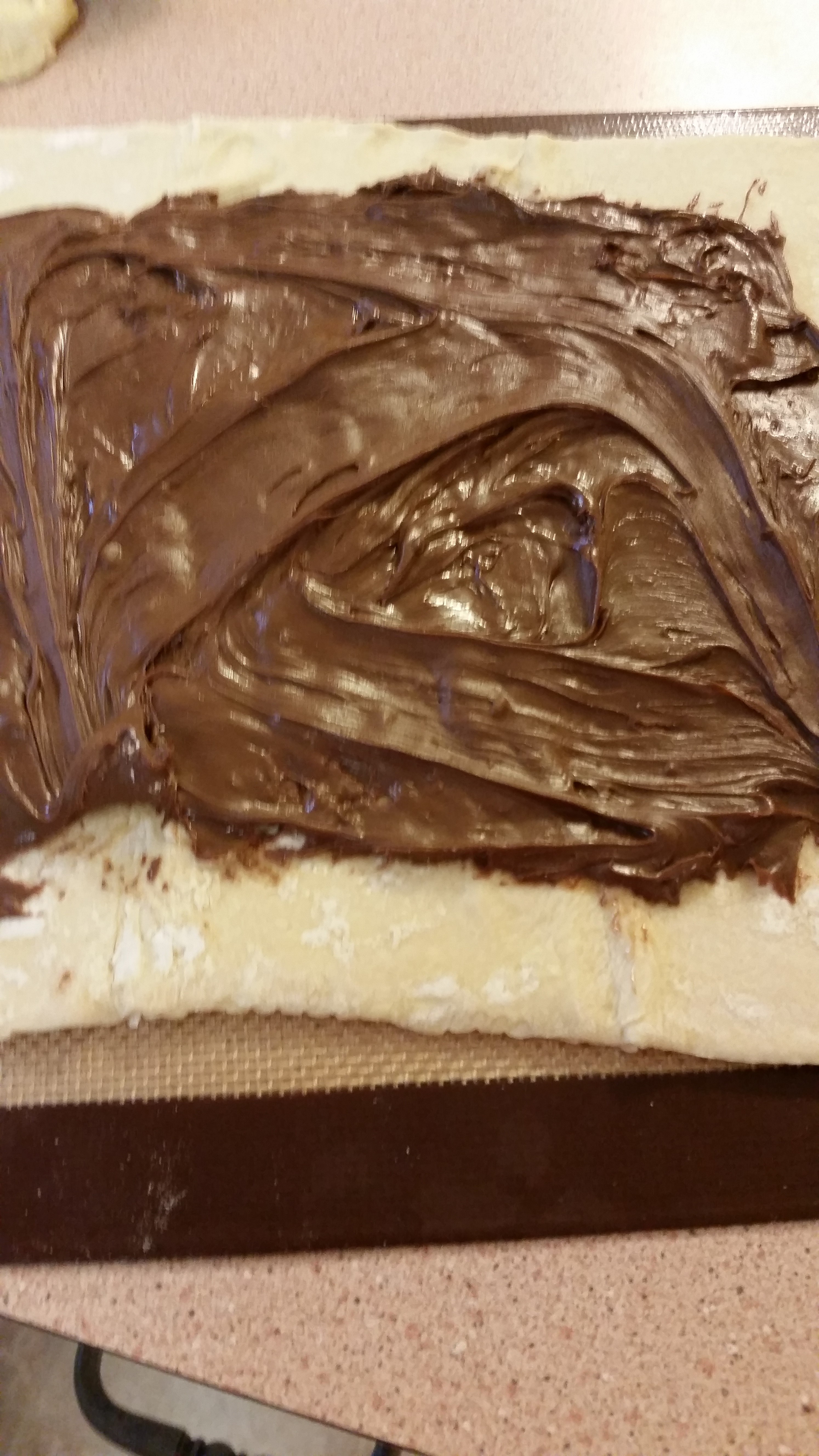 Take your puff pastry out and defrost it- follow the directions on the box. Preheat oven to 450. Put one puff pastry sheet down on a silicon baking sheet…get one of these. I actually want to buy more. They are awesome. Add your nutella to the bottom sheet.