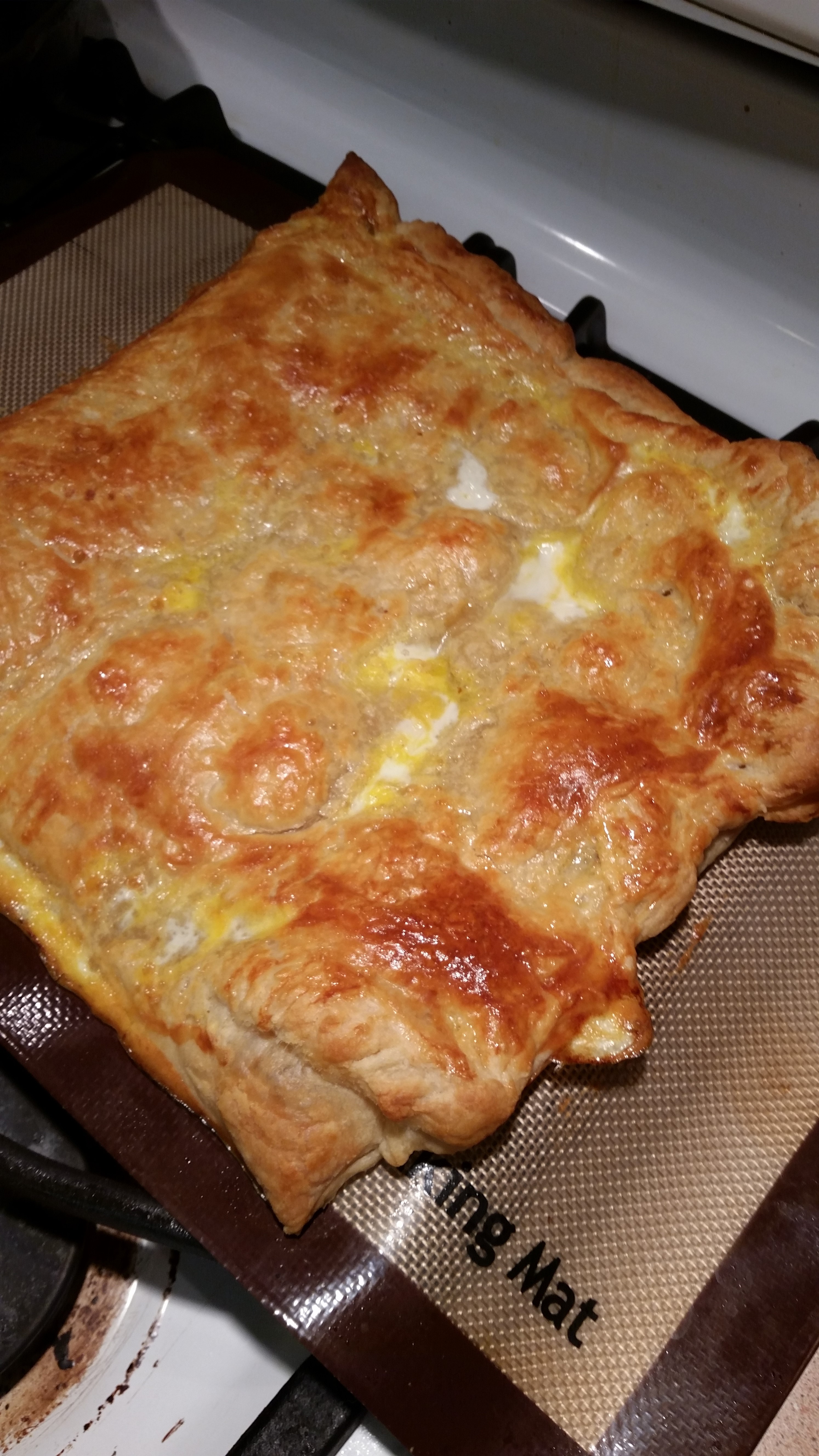 Cover that with your second puff pastry sheet. Crimp the edges, add your egg yolk on top with a pastry brush, and poke a few holes on top to let the steam escape.