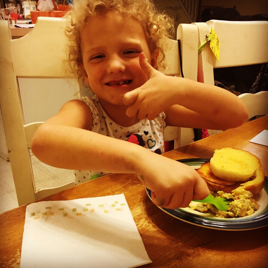 I told her I would make cheesy runny eggs with bacon, mushrooms, and potatoes. She said, “You can do that?” Yes, I can! I even let her help scramble the eggs and tear some tarragon =) We both gobbled it up and earned a spot in the clean plate club! I hope this inspires you to get in your kitchen and have a little fun!