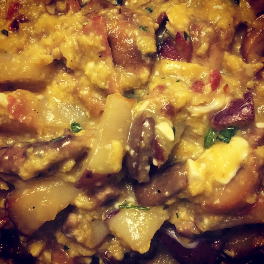 Soft Eggs with Mushrooms, Potatoes, Bacon, Feta, and Tarragon with Garlic Toast