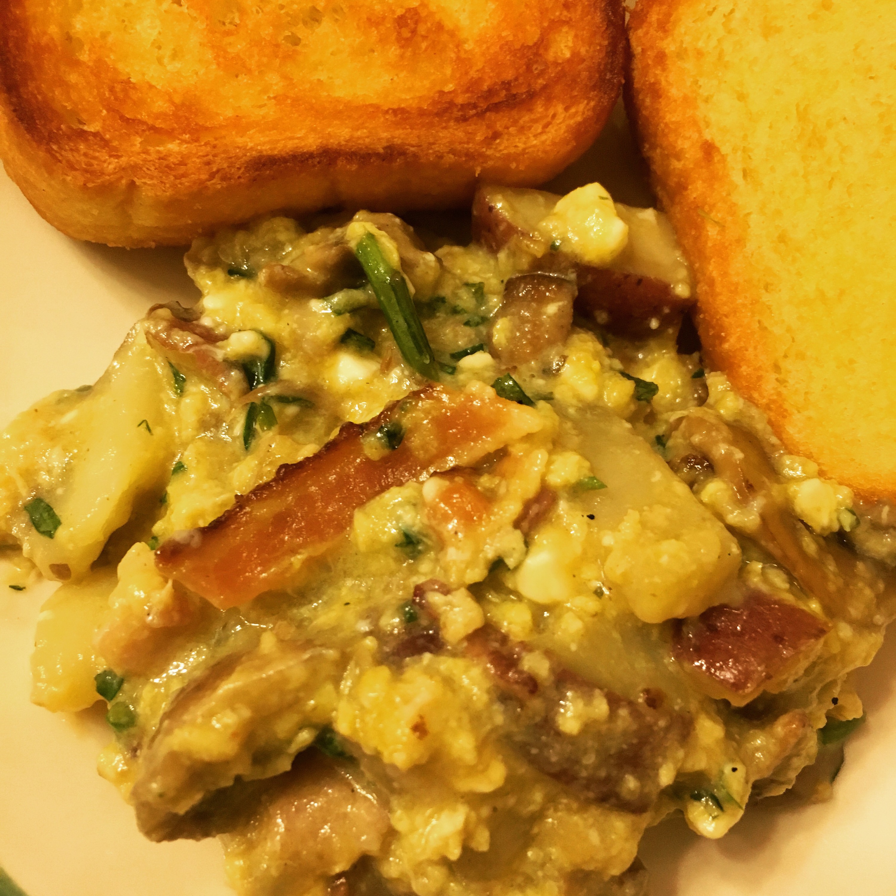 Soft Eggs with Mushrooms, Potatoes, Bacon, Feta, and Tarragon with Garlic Toast