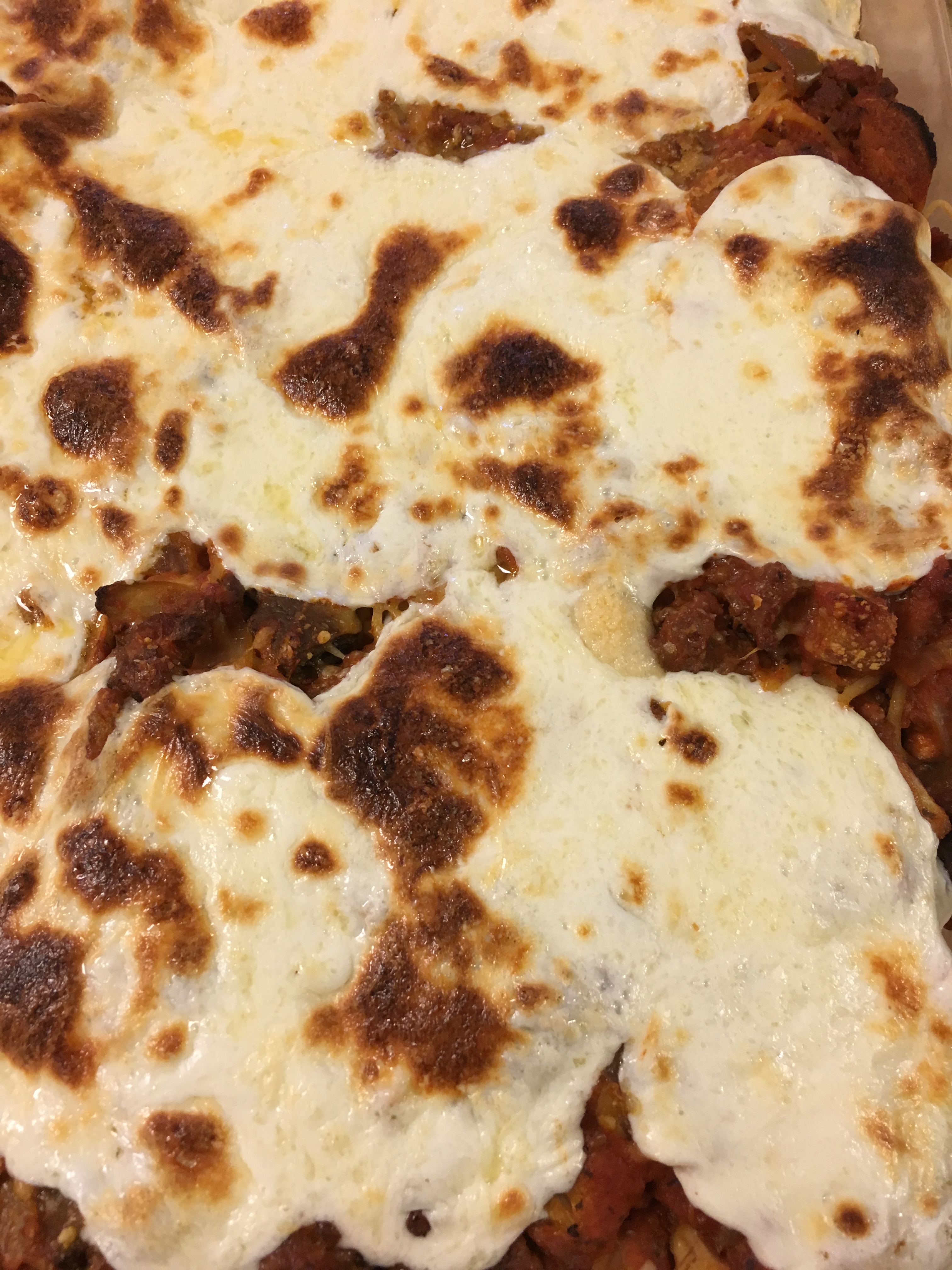 In a 9×13 greased pan/casserole dish start layering – place half the spaghetti in the pan. Add Meat Sauce. Add 2 Cups of mozzarella cheese. Cook for about 30 minutes or until the cheese melts and turns golden brown.