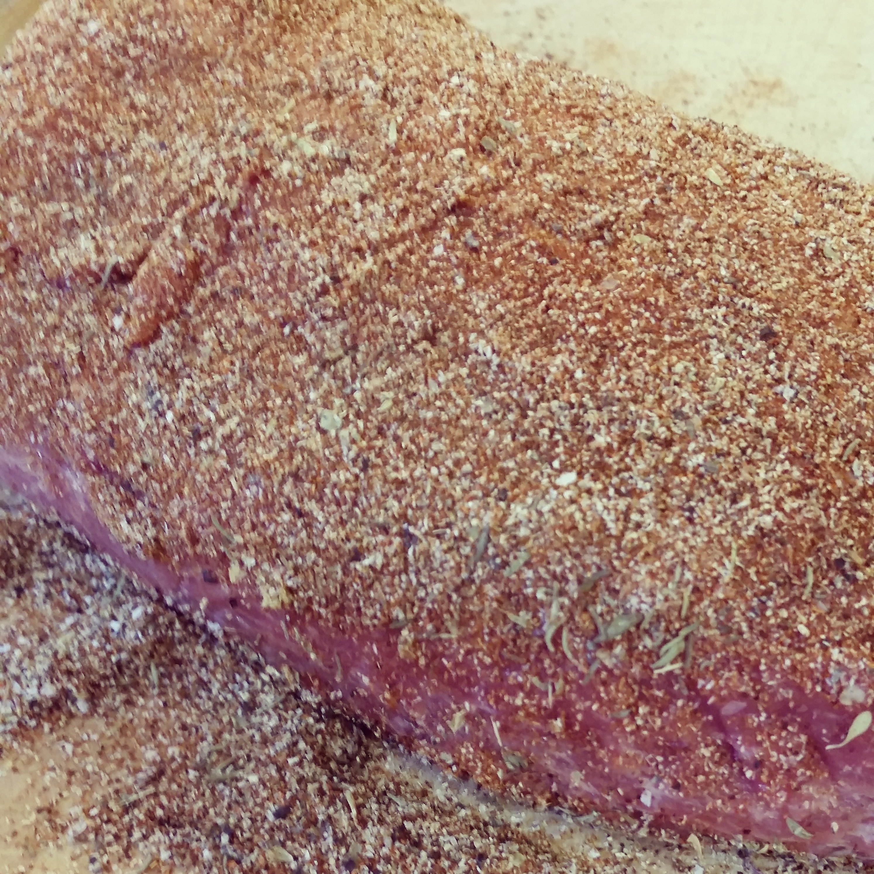 Spice Rub- 1 heaping teaspoon of chili powder, paprika, and cumin- 1/2 teaspoon each dried herb; oregano, thyme, marjoram, etc. use what you have. Add plenty of salt and pepper. Seasoning is a must, this is you chance for all the flavors to seep into the meat. Do not skimp. Spread on your pork.