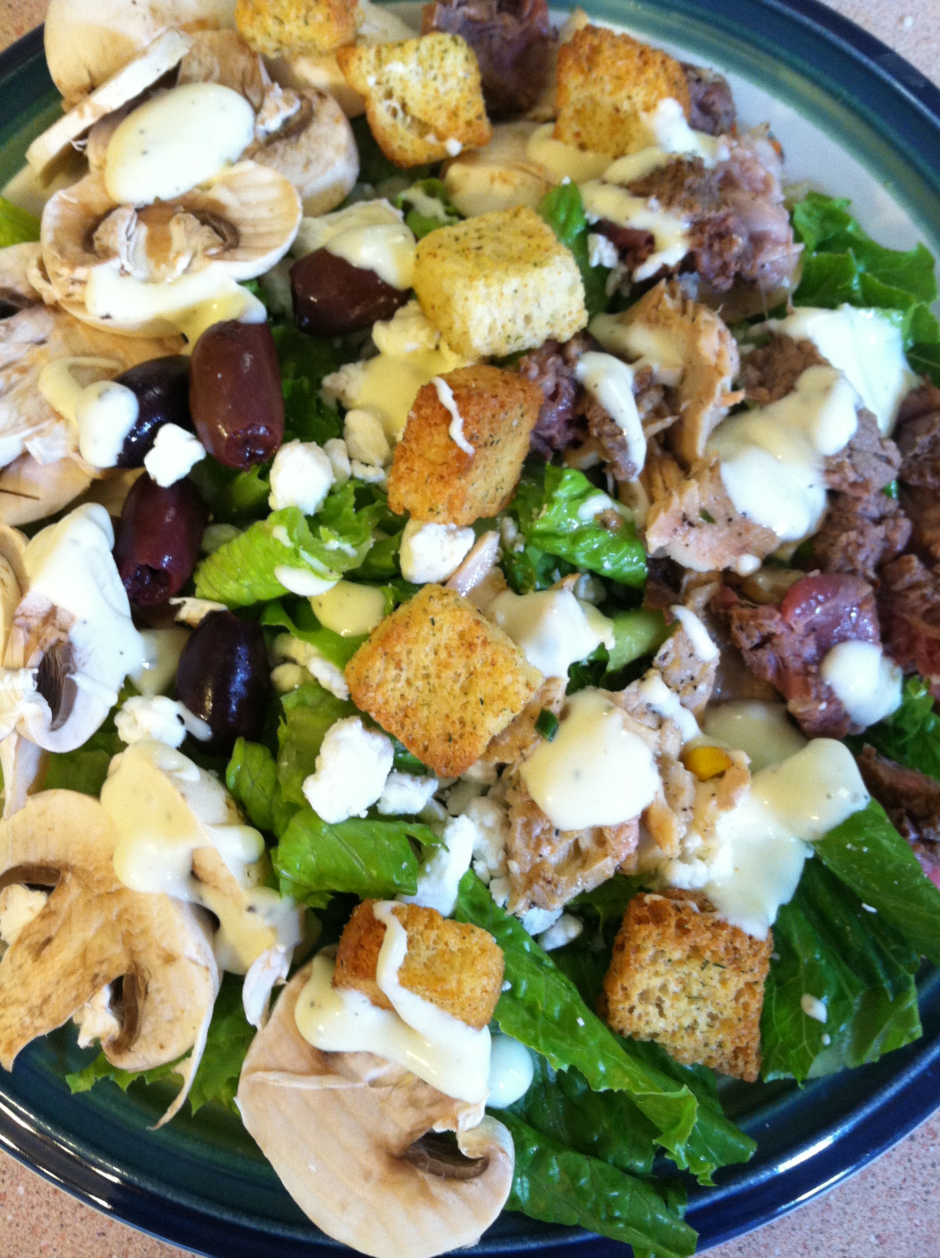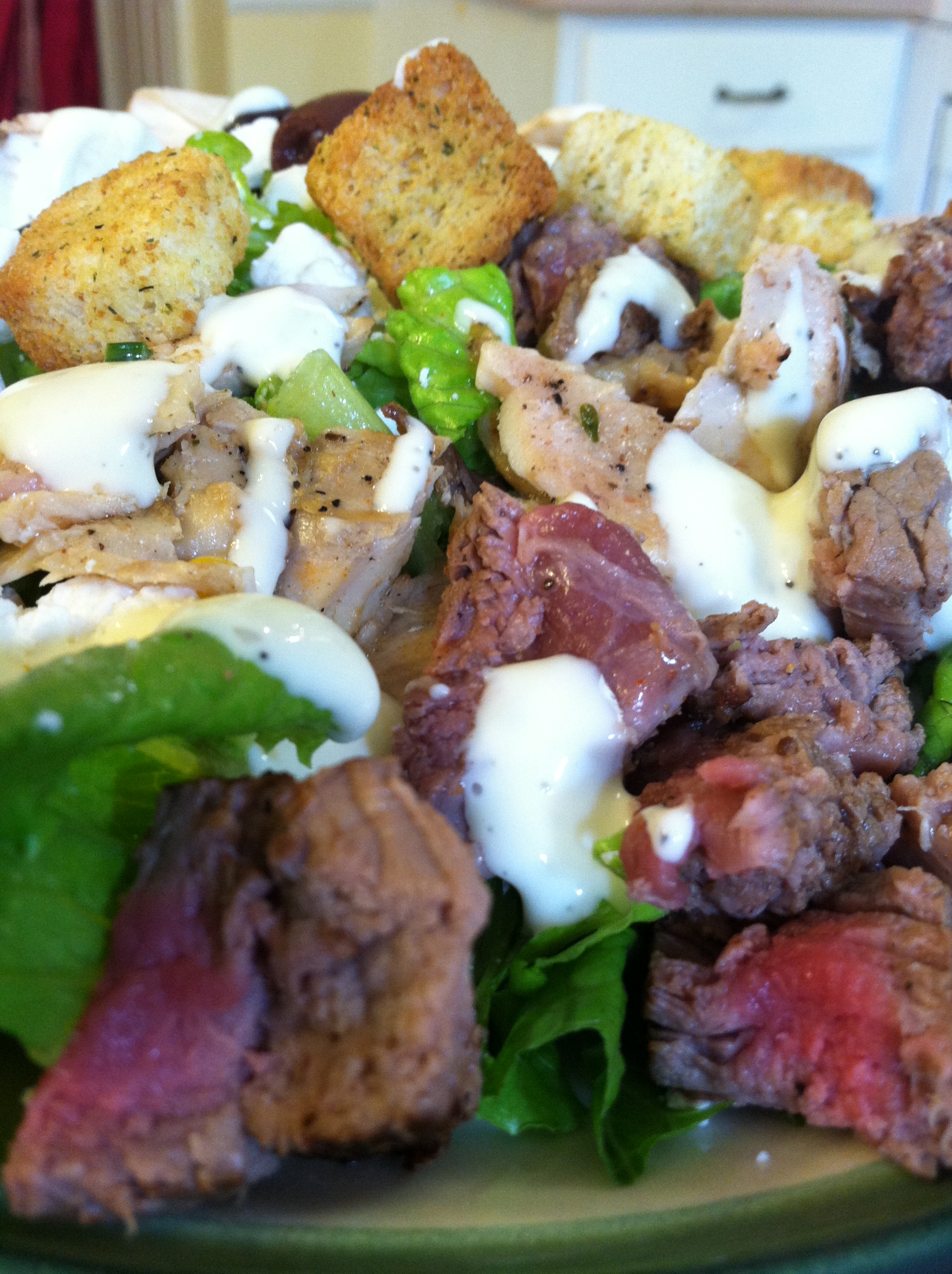 Hope you are having a terrific Tuesday! Here is a quick dinner I made for myself that is both healthy and indulgent. I added some of my oven roasted chicken (3/4 chopped breast), 2 boiled eggs, and 3 slices of chopped bacon on top of a generous serving of spinach. I topped with a few croutons and a tablespoon or so of dressing.
