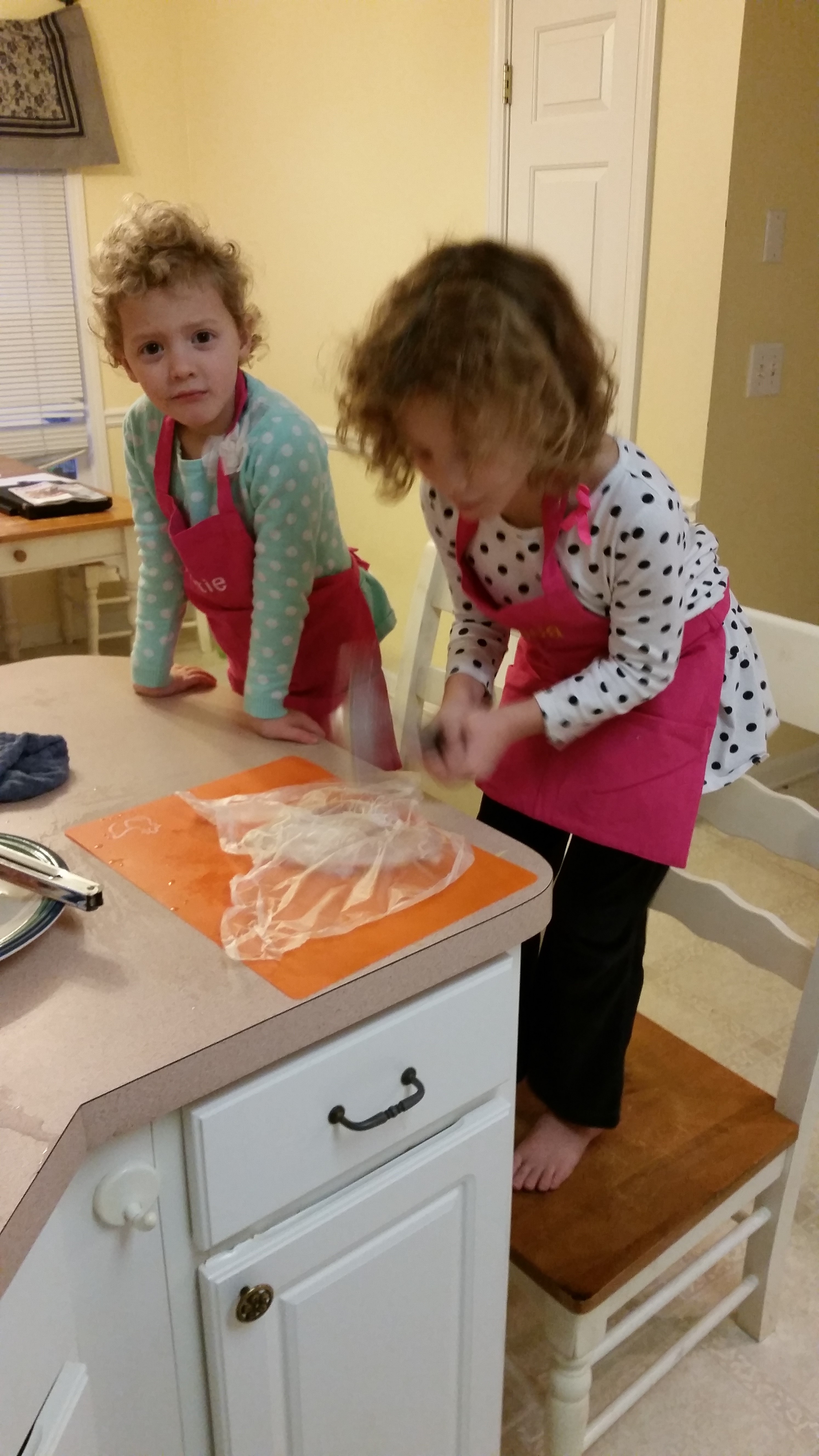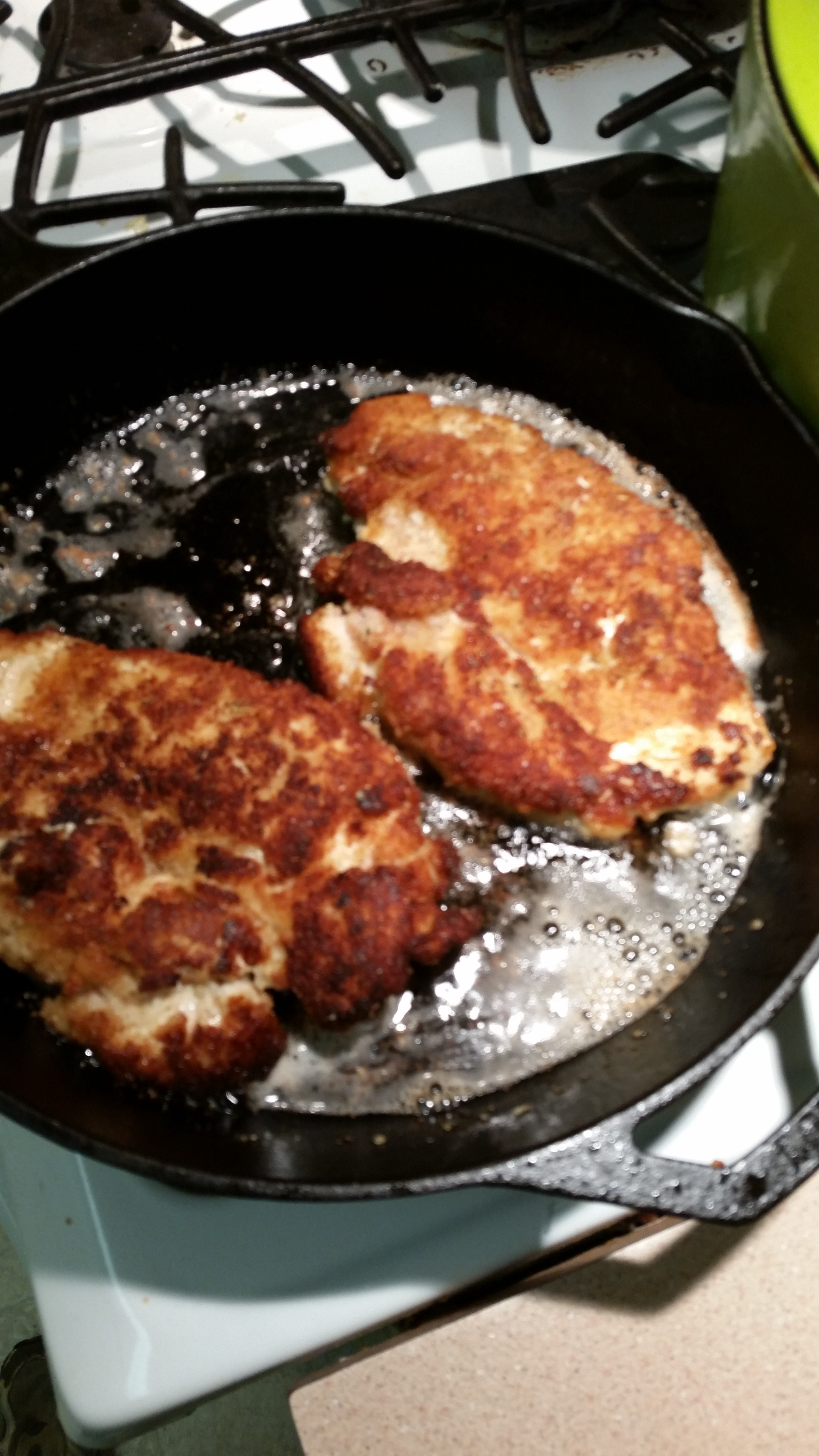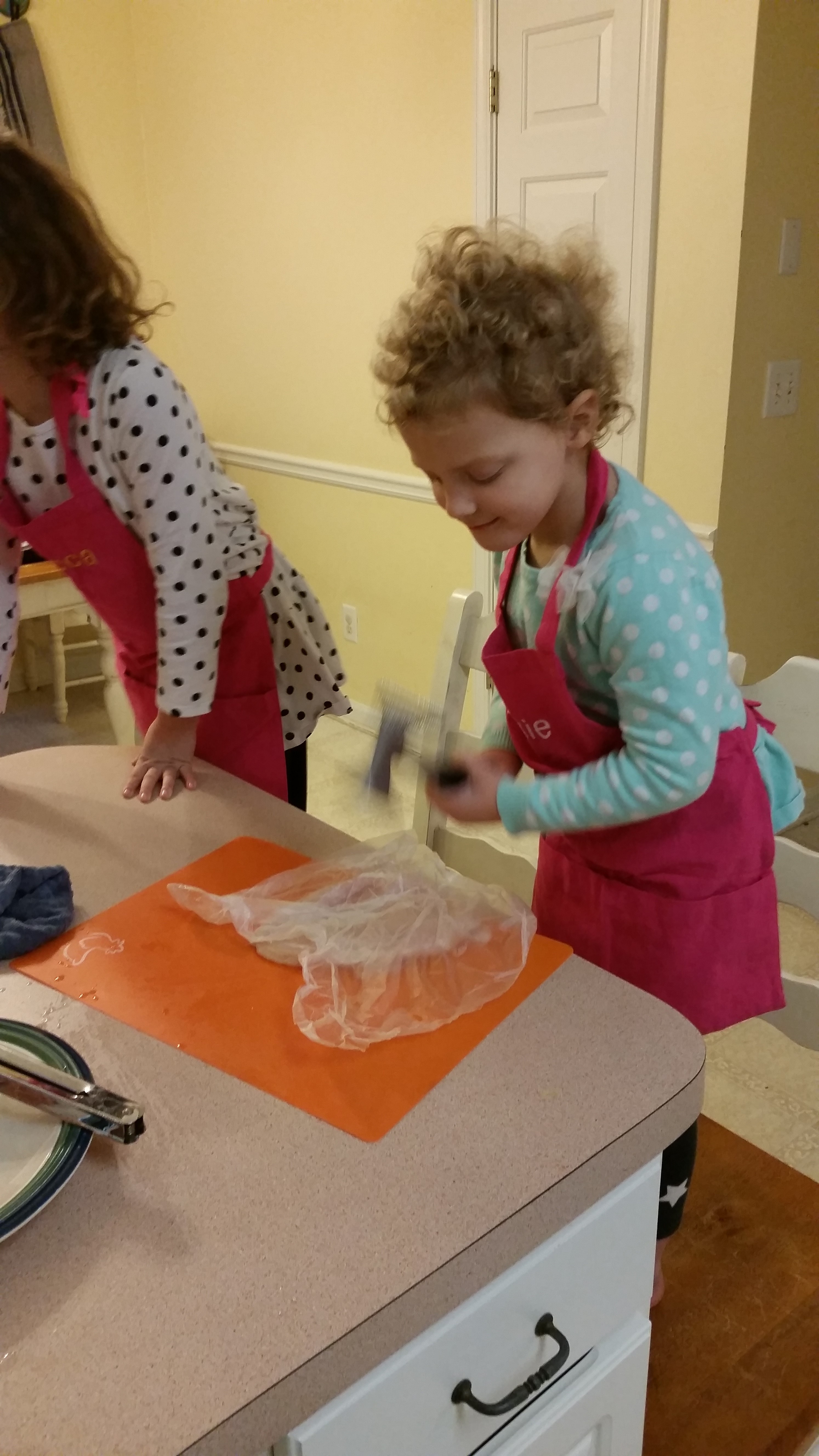 Pound the chicken breast between plastic wrap/wax paper with a mallet. It should be about 1/4 inch thick. It helps to have cute sous chefs…