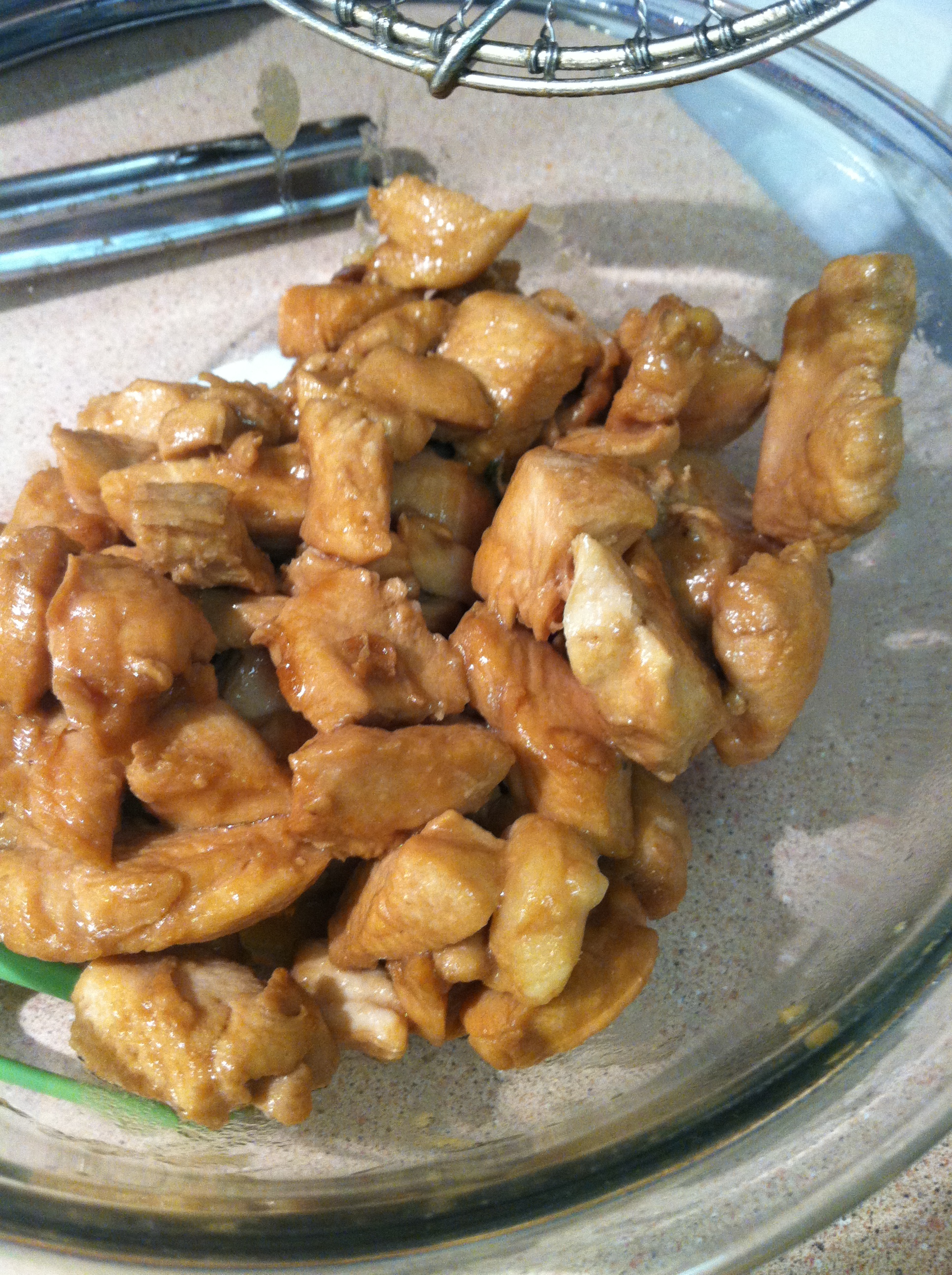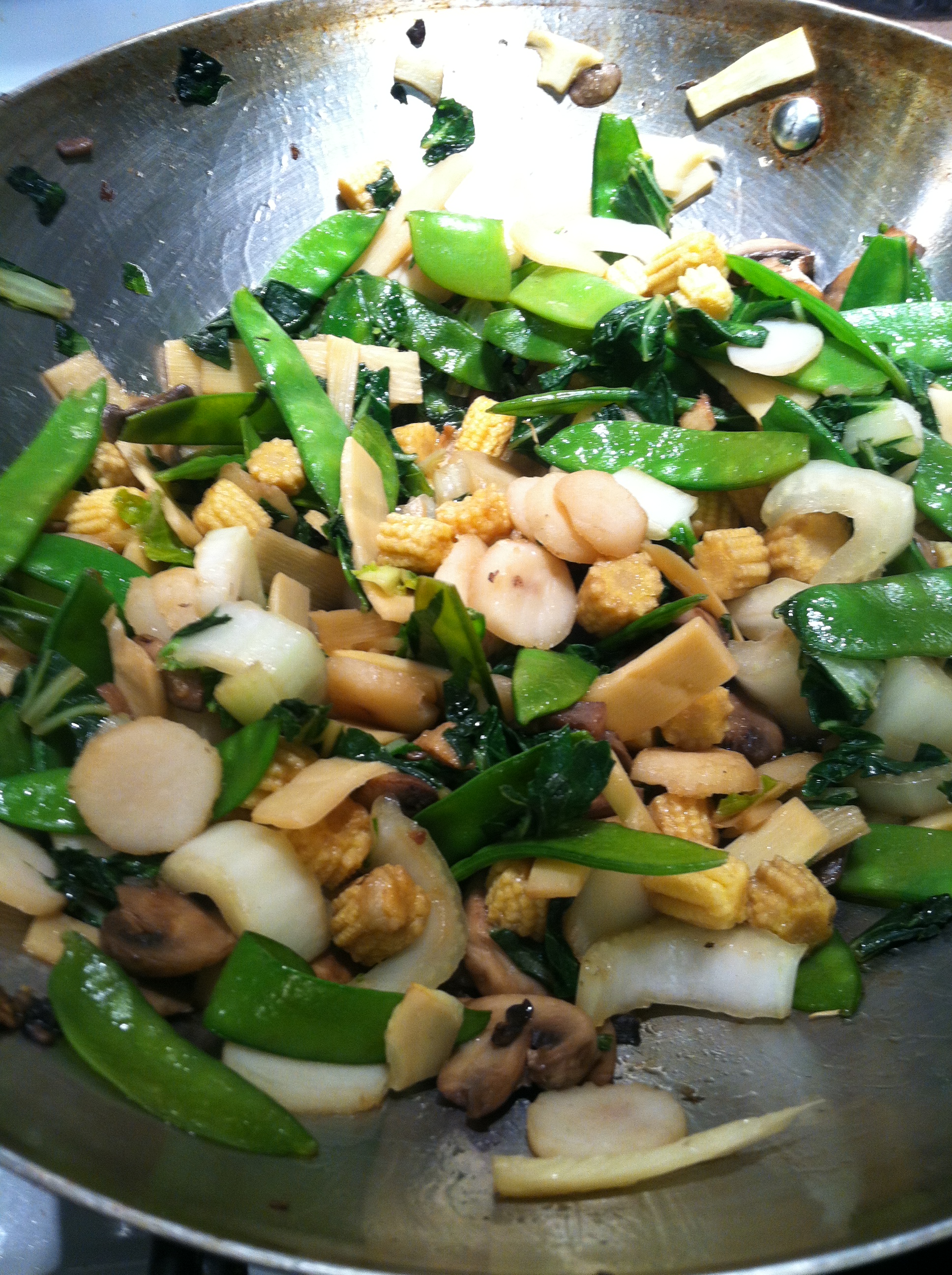 Combine all the veggies and chicken in a wok with a couple tablespoons of peanut oil. Add a splash of your stock, hoisin, and sesame oil. Cook on medium high heat until chicken is cooked through.