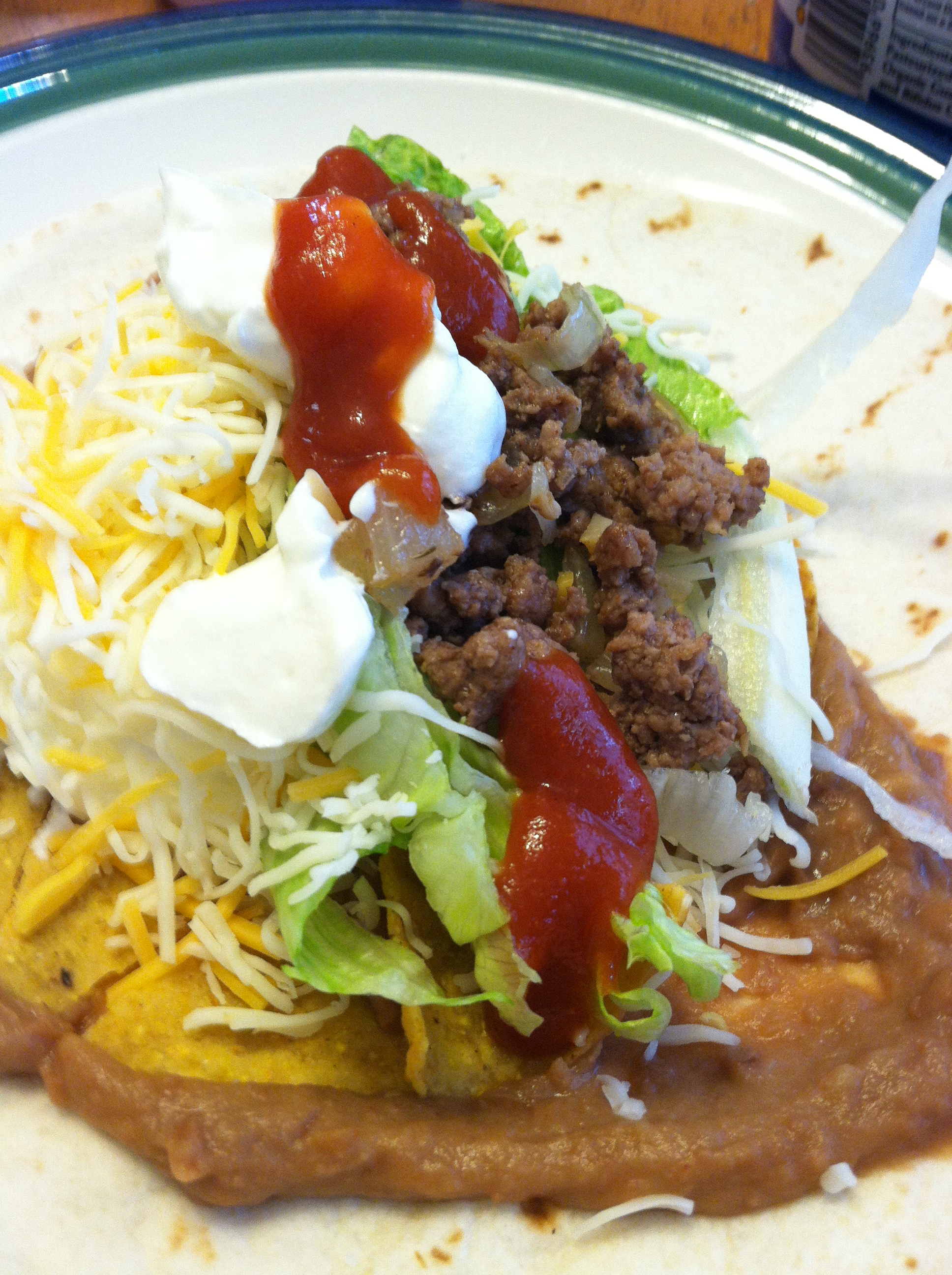 Tonight Rucks, Becca, and I had a gordita. Hard shell with all the fixings inside a soft tortilla spread with beans. Katie opted for a soft taco/burrito. Rucks likes Taco Bell hot sauce; I like Cholula. Becca and I like avocado. Katie and I like sour cream. Becca is a refried bean fanatic, so I let her pick out the kind she wanted. She picked vegetarian refried beans, and we all decided that we can’t taste a difference and we are saving like 5 grams of fat.