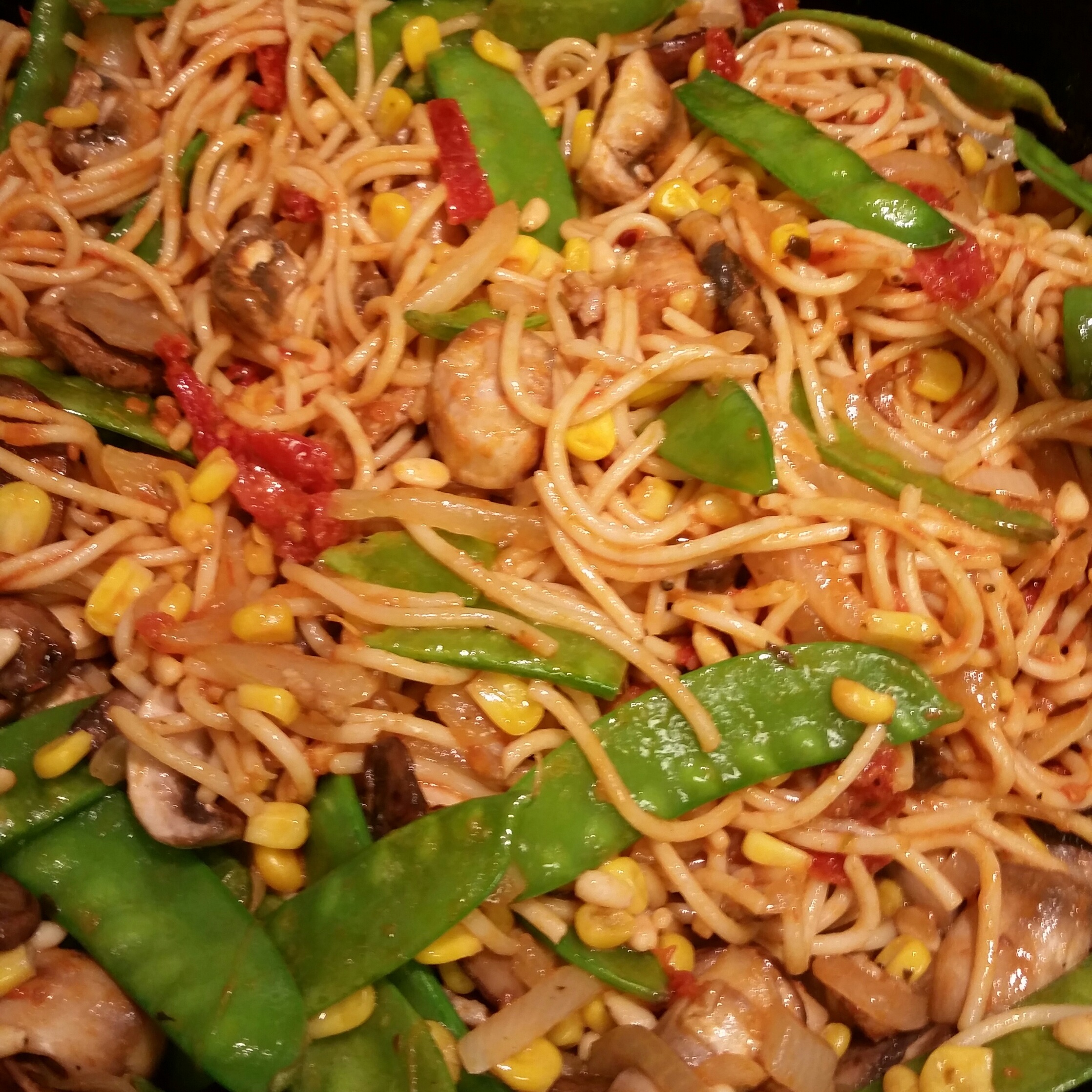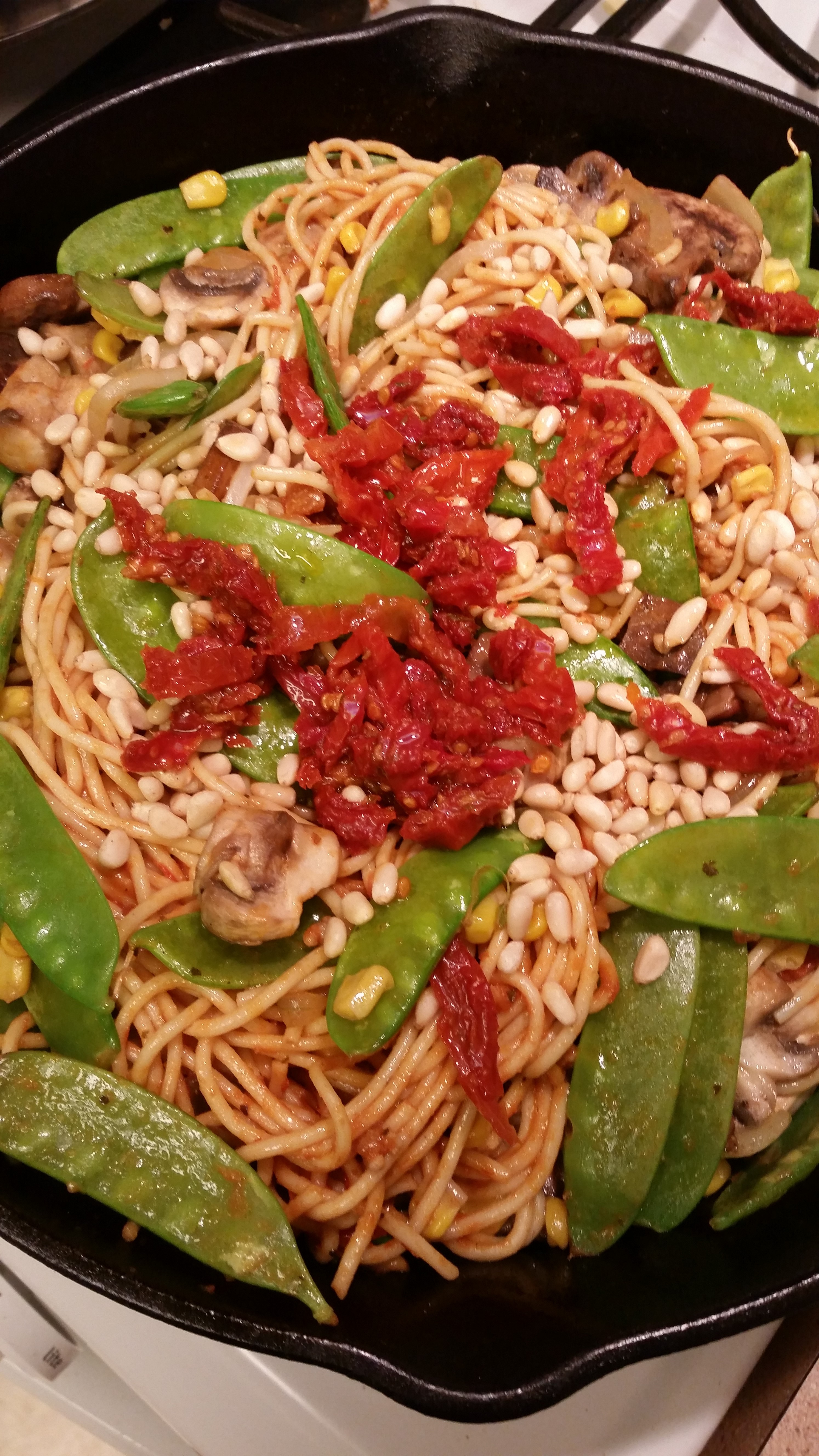 For dinner, I told the girls they could have breakfast for dinner. That ended up being cheesy scrambled eggs and frozen waffles. I made this for me and my friend who came over last minute. I used random ingredients in my fridge, pantry, and garden. I hope you always have some random ingredients to make a magic dinner! =)